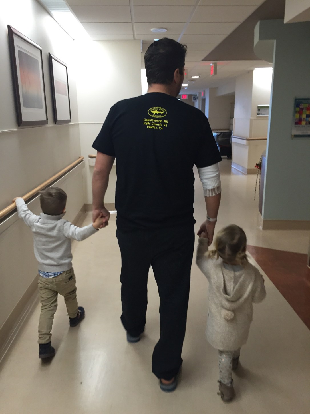 The kids were very excited to bring their own mini bottles of Purell and “keep their germs away” during their visit. Harrison walked in like he owned the place, and enjoyed telling his sister how things work at daddy’s hospital “office”. Mallory-Jane had some trouble understanding why she couldn’t roll all over Scott in bed and make herself comfortable, but she got over it. Both loved that daddy had their pillows from home in his room.