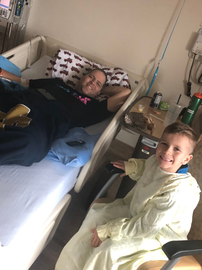 Today Harrison finally got to visit the hospital. Although FaceTime chats are awesome, being able to sit quietly, review sports stats and watch one of their favourite shows together was really needed. Even better is that Harrison was able to come alone today – without his sisters, who are hanging out with friends for the day. He’s been asking to visit since Scott was admitted, offering to sleep over with him or miss school (something that he actually doesn’t like to do) so that Daddy can have more company. But he was sick, and then MJ was sick, so they all had to keep their distance.